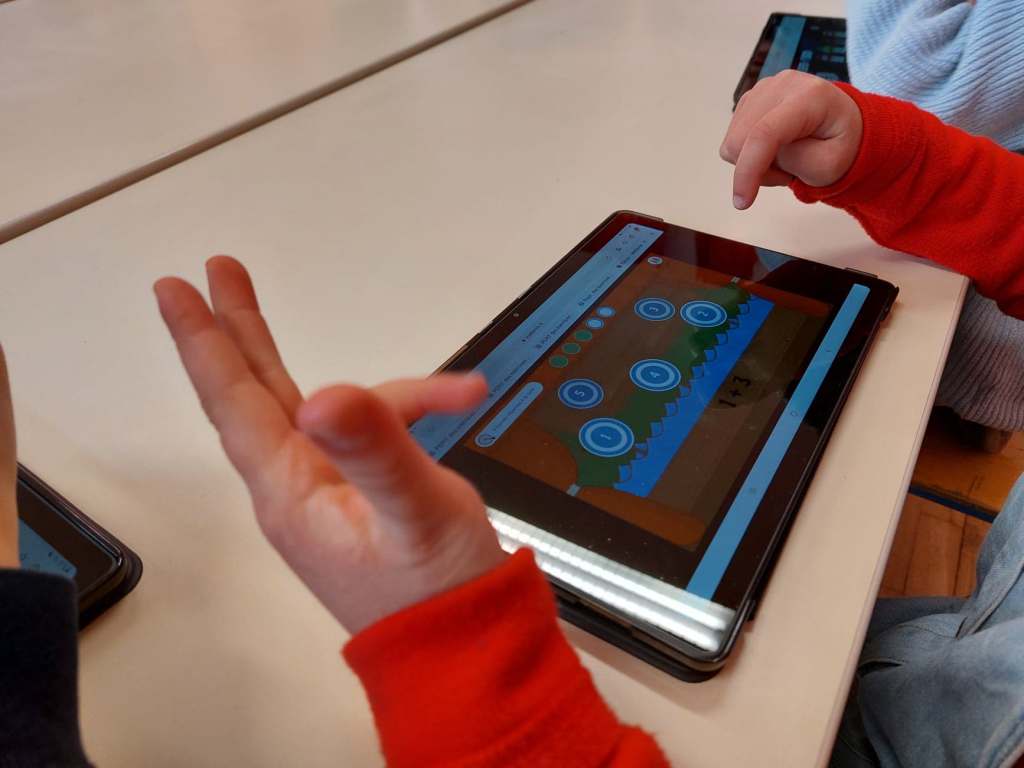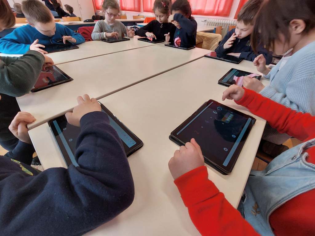 Ici, les élèves utilisent les tablettes pour réinvestir les notions de calcul.