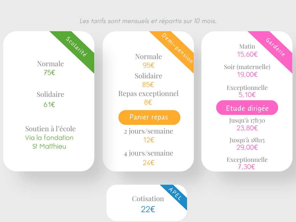 Remise de 10% sur les frais de scolarité à partir de 2 enfants, 50% à partir de 3 enfants.